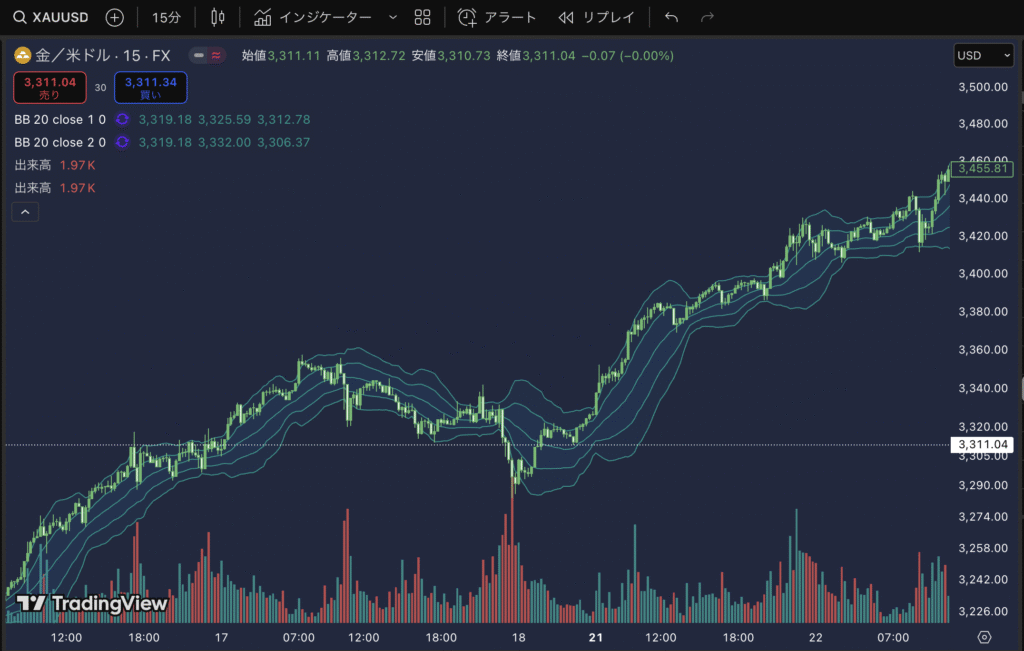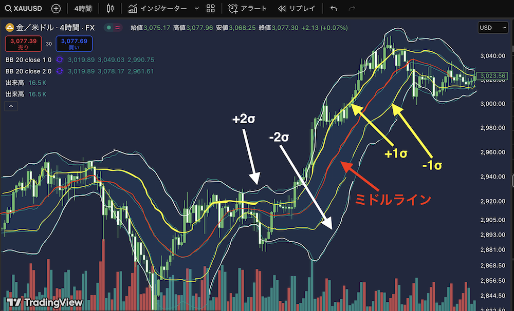 BBはミドルラインを中心にして、上下に±1σ、±2σ、±3σが並びます。(ただし、僕は±3σは表示させていません。)