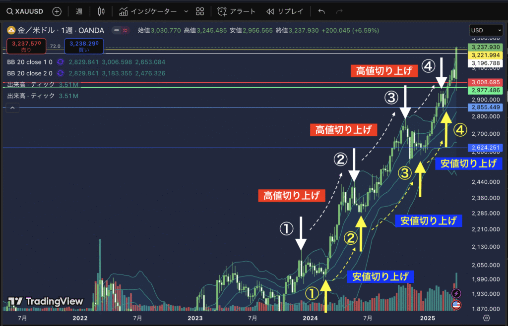 また、BBでは+2σから-2σまでの幅の広がりからトレンドの勢いや過熱感を判断することができます。