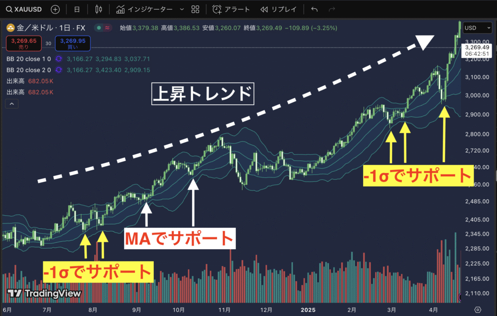 - 上昇トレンド・・・MA(1つ目のサポート)、-1σ(2つ目のサポート)