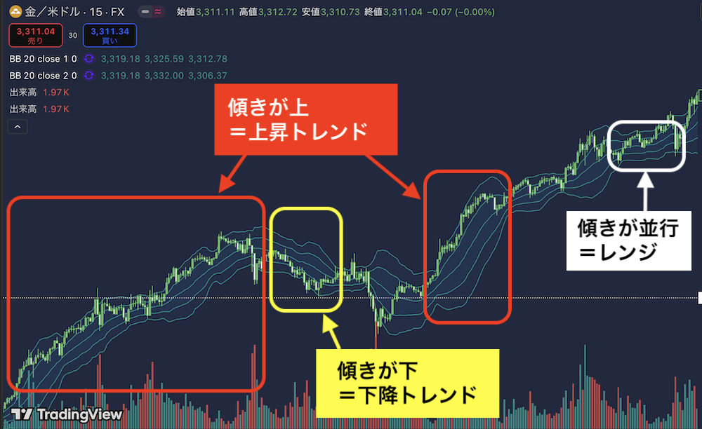 BBでは傾きや幅、ロウソク足との位置関係により、波の方向性や勢いを知ることができます。