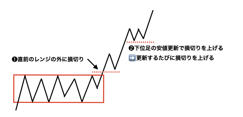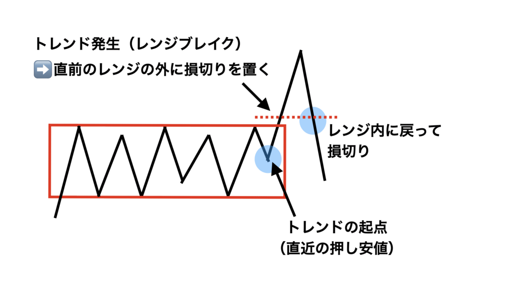 損切りの基本は、直近の高安値に置くことです。いきなりレンジの端に損切りを置くとすぐ狩られるので、エントリーしたタイミングによりますが、トレンドがしっかり伸びたのを確認したうえでレンジの端に置くと良いと思います。