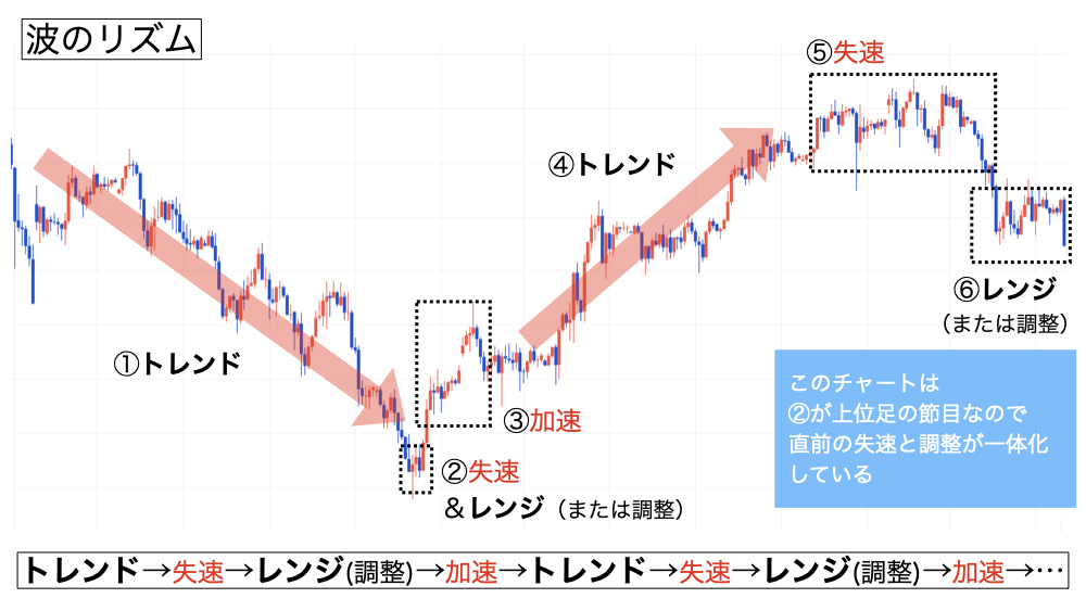 僕は、この一連の流れ全体を「波のリズム」と呼んでいます。次は、チャートの一部を切り取り、このリズムをどう読み取るのかを確認していきます。