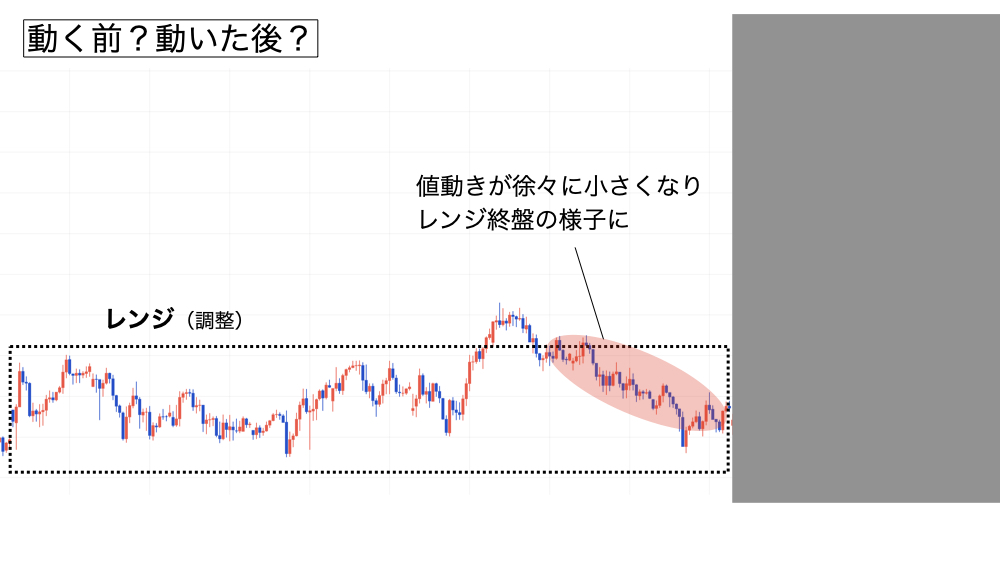 | レンジ(収縮) | 小さくなる | 動く前 | あり | エントリー準備 |